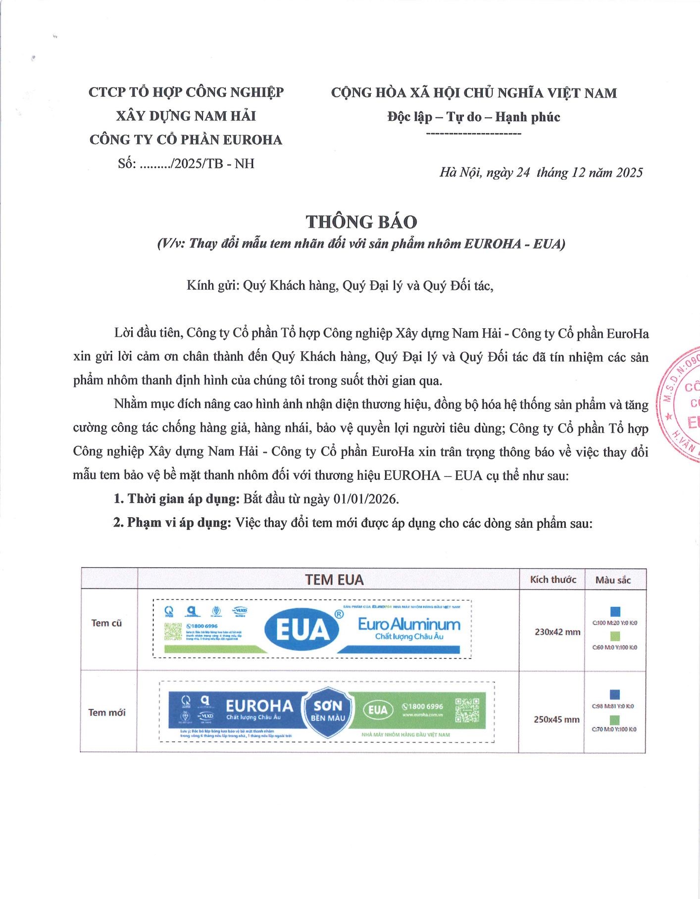 Công ty Công ty Cổ phần EuroHa xin trân trọng thông báo: từ ngày 01/01/2026, Nam Hải Group – EuroHa chính thức áp dụng mẫu tem bảo vệ bề mặt thanh nhôm mới cho toàn bộ sản phẩm nhôm với thương hiệu EUROHA – EUA trên toàn quốc.