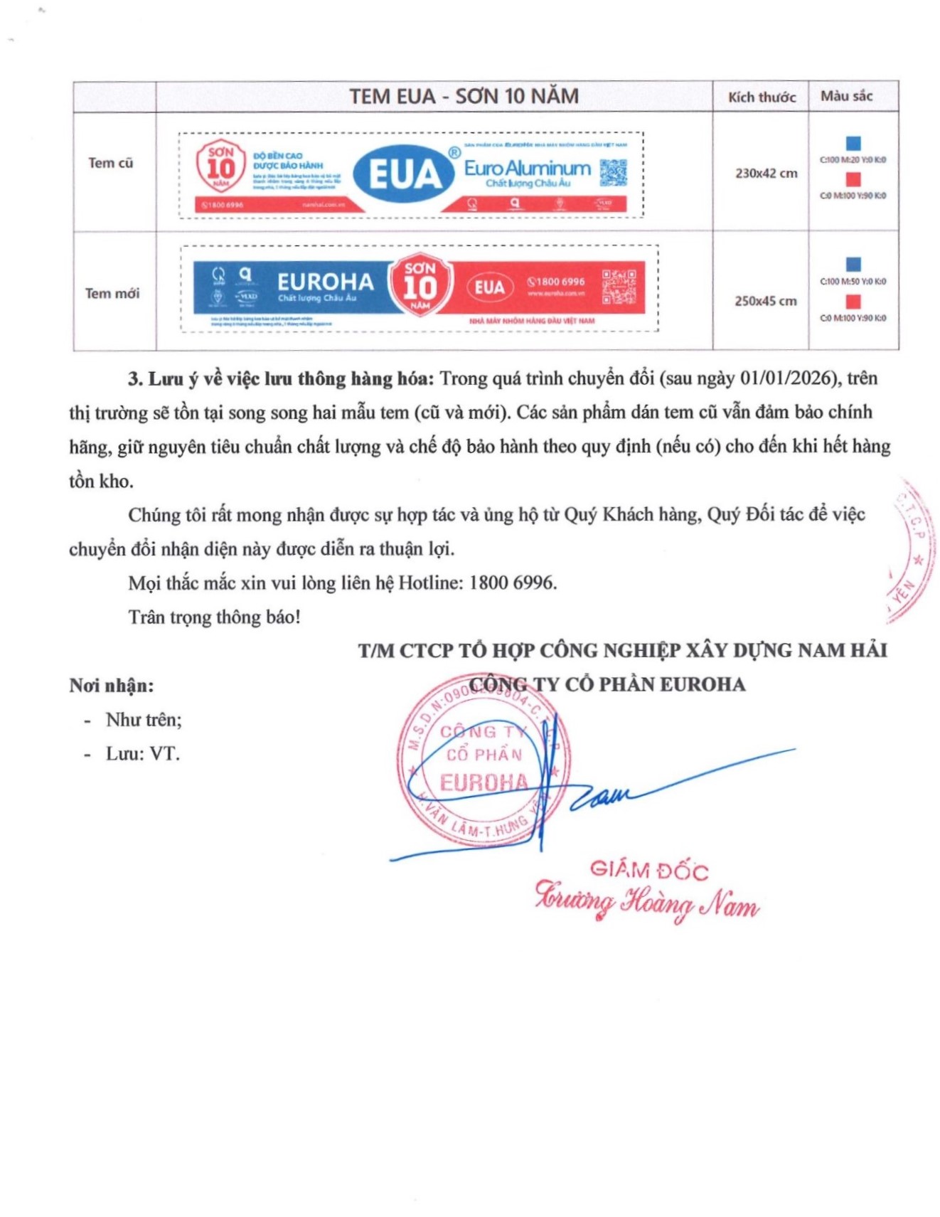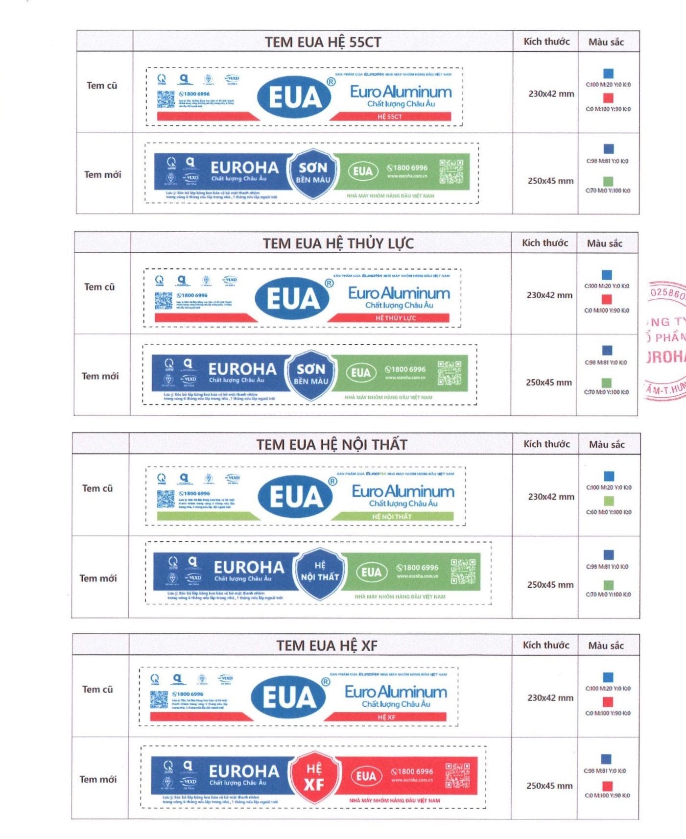 Mẫu tem mới được áp dụng cho toàn bộ các dòng nhôm EUROHA – EUA và triển khai đồng bộ trên toàn quốc. Trong quá trình chuyển đổi (sau ngày 01/01/2026), trên thị trường sẽ tồn tại song song hai mẫu tem (cũ và mới). Các sản phẩm dán tem cũ vẫn đảm bảo chính hãng, giữ nguyên tiêu chuẩn chất lượng và chế độ bảo hành theo quy định (nếu có) cho đến khi hết hàng tồn kho.